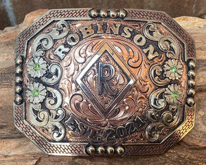 Octagonal shaped buckle with beads on the outer compass points. Your choice of stones in the flower accents on the right and left of the CMSA logo of your choice. Unique tooled circle in the center that holds the logo surrounded with the wording of your choice. Unique brick design on the outer frame.