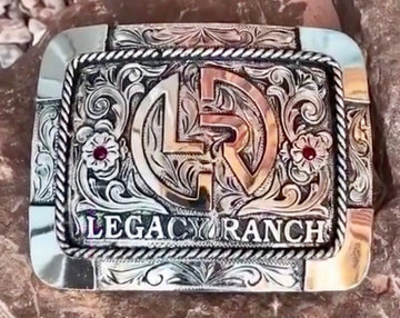 Rectangle shaped buckle with tooling on the compass points. Beautiful filigree center surrounded with a rope border. 2 stone filled flowers sit to the left and right of the CMSA logo of your choice that is all above one bold line of text.