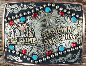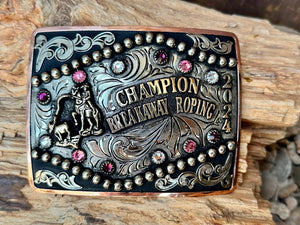 Beautifully handcrafted completely customizable belt buckle. You are able to select your wording, change metal colors on the buckle and stone colors to create a one of a kind piece. This is a great gift for yourself or as a trophy items to give away for your events.