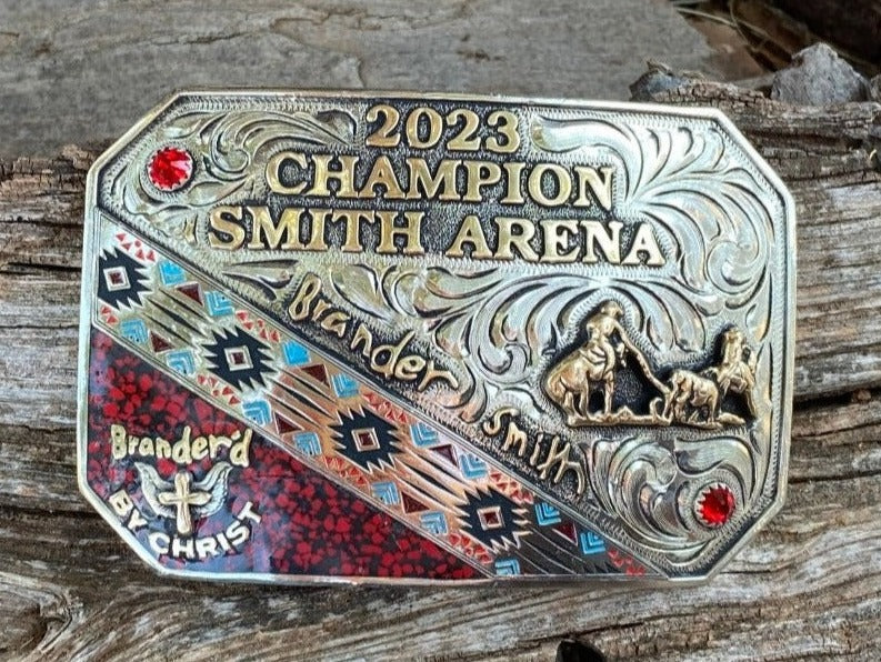 Beautifully handcrafted completely customizable belt buckle. You are able to select your wording, change metal colors on the buckle and stone colors to create a one of a kind piece. This is a great gift for yourself or as a trophy items to give away for your events.