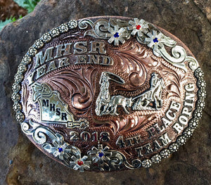 Beautifully handcrafted completely customizable belt buckle. You are able to select your wording, change metal colors on the buckle and stone colors to create a one of a kind piece. This is a great gift for yourself or as a trophy items to give away for your event.