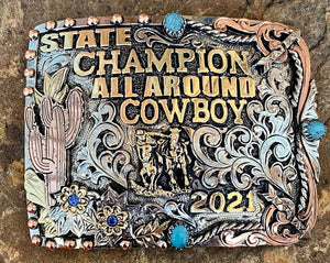 Beautifully handcrafted completely customizable belt buckle. You are able to select your wording, logo, and change metal colors on the buckle and stone colors to create a one of a kind piece. This is a great gift for yourself or as a trophy items to give away for your event.