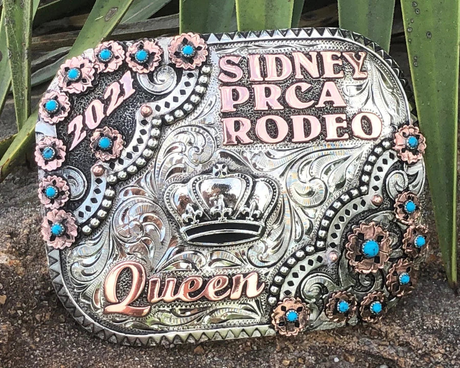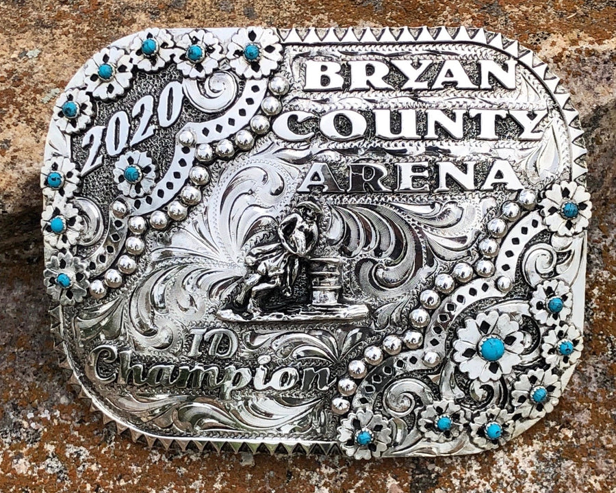Rounded rectangle buckle with stone filled flowers on 2 corners. Tooled background with your choice of CMSA logo.