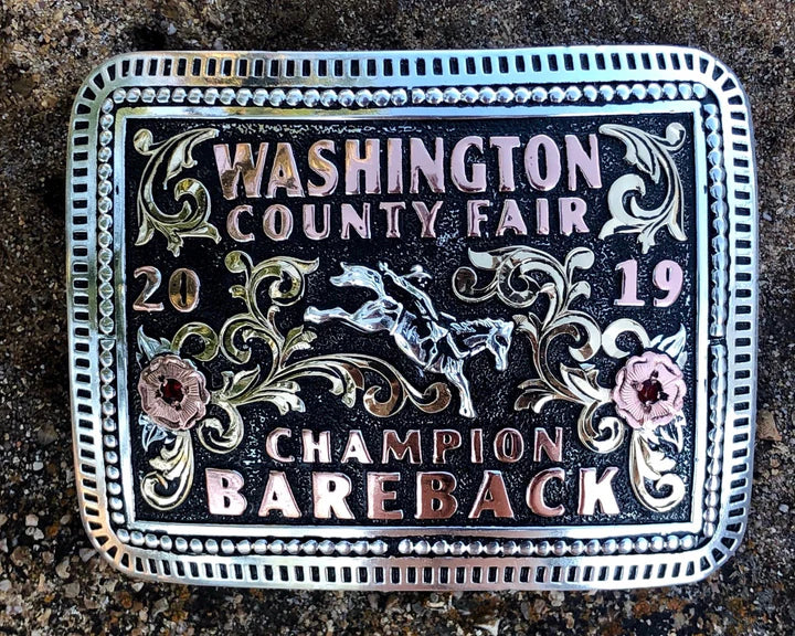Beautifully handcrafted completely customizable belt buckle. You are able to select your wording, change metal colors on the buckle and stone colors to create a one of a kind piece. This is a great gift for yourself or as a trophy items to give away for your event.