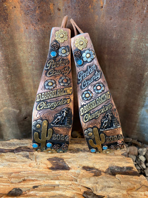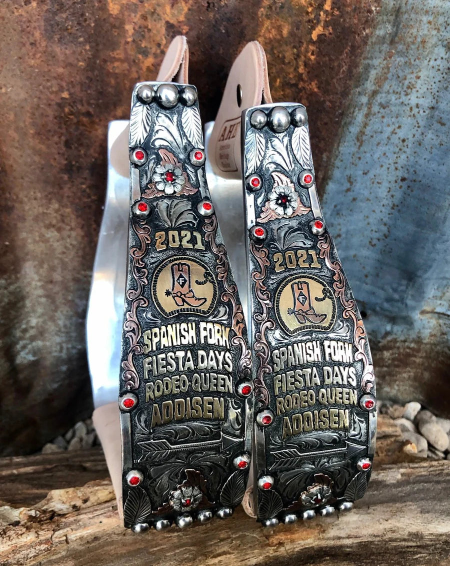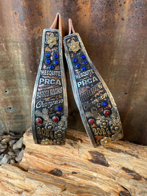 Beautifully handcrafted completely customizable stirrups. You are able to select your wording, change metal colors and stone colors to create a one of a kind piece. This is a great gift for yourself or as a trophy items to give away for your events.