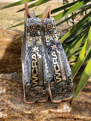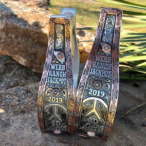 Customizable 2 inch thin stirrups available with you choice of CMSA logo, stones, metals, and paint. Contact CMSA, 888-960-0003 Ext 101, for assistance.